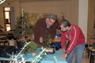 Uno a uno, nuestros árboles fueron supervisados por ambos instructores, los cuales nos iban enfocando el trabajo sobre ellos. Posible frente, alambrado, ángulo de plantado, trasplante, todo iba siendo tenido en cuenta en cada bonsái para sacar el mejor partido a estos ejemplares.